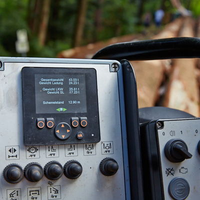 Auf dem Kran oder im Fahrerhaus können Achslasten, das aktuelle Gesamtgewicht und der aktuelle Schemelabstand zentral abgelesen werden.